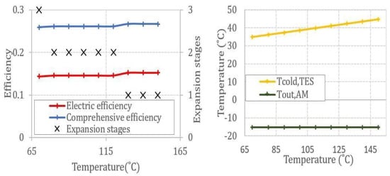 T-CAES efficiencies and the optimal number of expansion stages (left) and the temperature output of AM and of the cold TES (right) as a function of the temperature of hot TES.