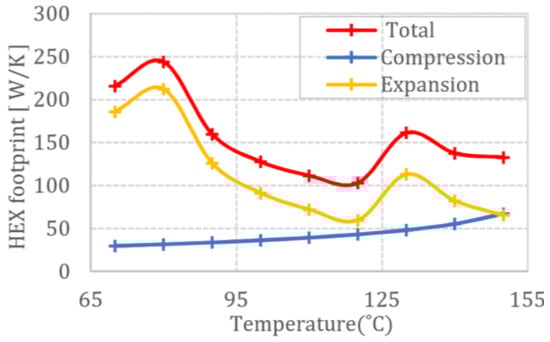 At constant Ne, the HEX footprints of the discharging phase decrease substantially (Figure 3) since the logarithmic mean temperature LMTD grows, assigned to the rise of the water output temperature of TES (Figure 2). The maximum values of HEX footprints are achieved at the critical values of hot, TES with a general declining trend due to the decrease of Ne. The variation of the total footprint follows that of the discharging phase HEX footprints tendency given the small rise of the HEX footprints of the charging phase.