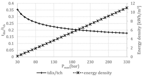 Discharge to charge time ratio and energy density as a function of the maximum storage pressure.