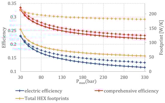 In Figure 5, the comprehensive and the electric efficiency decrease sharply as the maximum storage pressure increases from 30 to 130 bars, then they decrease at a moderate rate. This is mainly due to the increase of the compression energy related to the compression ratio power 0.2 (taking the polytropic coefficient equals to 1.25). The total HEX footprints decreases also since the LMTD increases.