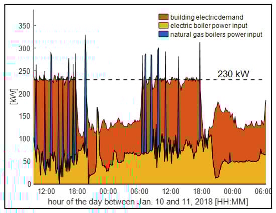 In this study, the CanmetENERGY Centre, located in Varennes, QC, was considered as case study. The building is a 3770 m2 single storey building hosting roughly 120 workstations and 10 meeting rooms. Heating is provided by a 170 kW electric boiler and two 450 kW natural gas boilers. When heating is needed, the electric boiler is always started first. The natural gas boilers are turned on when the electric boiler cannot meet the heating demand by itself. This is a common configuration for institutional and commercial buildings in Quebec that underwent a retrofit of the heating system. Part of the monthly electric bill is due to the peak electric demand, as the electric energy utility charges per kW of monthly peak demand. In order to reduce peak demand, the total electrical power supplied to the building, which corresponds to the sum of the electric boiler power and the building electrical baseload (e.g., workstations, lighting, appliances, experimental test benches, etc.), is limited to 230 kW. Since the electric baseload has the priority, the electric boiler power input is kept within the margin between the 230 kW total power limit and the baseload power. For instance, at night during week days in January, the value of the baseload is about 80 kW. Thus, the electric boiler power input cannot exceed 150 kW (i.e., 230 kW–80 kW). Figure 1 shows the profiles of the building electric demand, the electric boiler power input, and the natural gas boiler power input for a few days in January 2018.