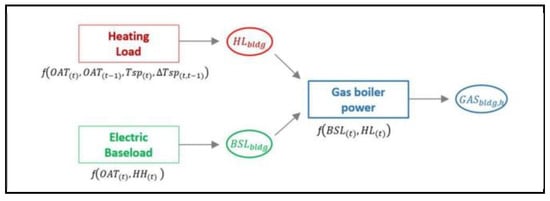 - Finally, the third model (grey in Figure 3) predicts the gas boilers power input at time t as function of both the building heating demand and the electric baseload.
