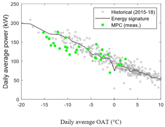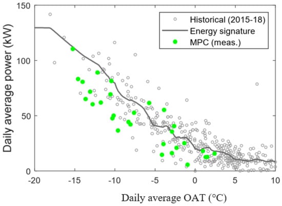 Assessment of energy savings: The assessment of energy savings due to MPC implementation is performed by comparing the measured energy consumption under MPC to the expected energy consumption under BAU control. For this purpose, two “energy signature” (benchmark) models of the building were developed. These models predict the building daily average heating load and gas power input under BAU control as function of the outdoor air daily average temperature and the day of the week. Historical data from winters 2015–2018 were used to develop two GPR-based energy signature models. The role of the energy signature models is to provide a benchmark of the building energy consumption, in order to assess the performance of new control strategies []. The benchmark models use outdoor air temperature and the day of the week to predict how the BAU strategy would perform.