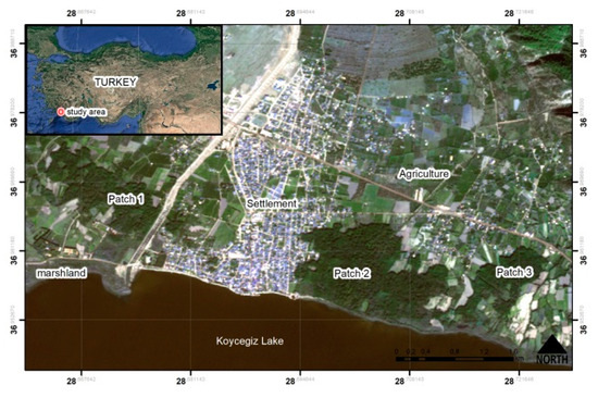The study area is the town center of Koycegiz, Mugla province of Turkey. The reason for selecting as the test site was the hosting of endemic sweetgum (Liquidambar orientalis) tree populations while being under pressure of environmental land-uses. The test area has the center coordinates of area 36° 58′17′′ N and 28 ° 41′20′′ E, located in the south-west of Turkey (Figure 1).