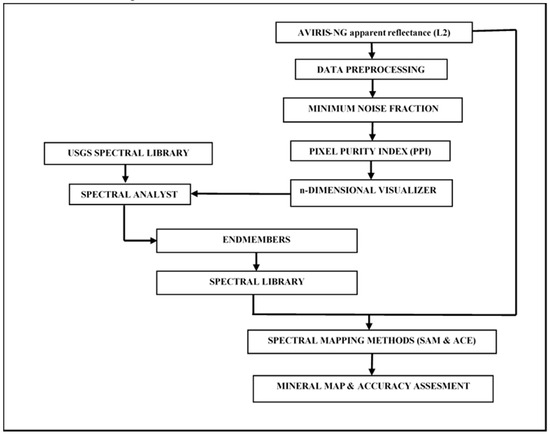 In this study, 364 VNIR (Visible and Near Infrared) and SWIR (Short wave infrared) channels out of 425 ranging from 376 to 2500 nm were analyzed for the identification of hydroxyl, carbonate, and iron-bearing mineral phases, and to map the basis of the nature and shape of diagnostic absorption features of minerals. Figure 1 describes the methodology/algorithm adopted for this study using a flow diagram. The apparent reflectance product (L2) was linearly transformed through minimum noise fraction (MNF) transform, which is a doubly cascaded principal component analysis [22]. The first step segregated the data in terms of noise and the second step was a standard statistical method i.e. Principal component analysis (PCA) transformation applied to the noise-whitened data. The MNF transformation calculated noise statistics in terms of eigenvalues from the input data. Eigenvalues were then used to understand the data dimensionality, which allows one to choose the maximum suitable MNF bands for further processing [22]. Subsequent to data dimensionality reduction, a pixel purity index (PPI) image i.e. image pixels containing spectrally most pure characteristic signatures, was generated to identify the spectrally pure pixels within the area. In the PPI image, each pixel value corresponds to the number of times that pixel was recorded as extreme. The n-dimensional visualizer was used to locate, identify and cluster the purest pixels and the most extreme spectral responses in a dataset. The spectra collected by the n-dimensional visualizer were used as endmembers to run the SAM (Spectral Angle Mapper) and ACE (Adaptive Coherence Estimator) classifier. Before running the SAM classifier, the identification of endmember spectra was obtained by comparing with the available predefined mineral spectra from the United States Geological Survey (USGS) spectral library, using the ENVI 5.0 (Research Systems, Inc., Boulder, CO, USA) spectral analyst tool. Well established mapping methods namely SAM and Spectral feature fitting (SFF), were used for the identification of the collected endmember spectra. SAM is a physical based spectral classification method that uses an n-D angle to match pixels to reference spectra. The algorithm determines the spectral similarity between two spectra by calculating the angle between the spectra and treating them as vectors in space with dimensionality equal to the number of bands [23]. In this study, a single value threshold of 0.1 rad was used as the maximum angle threshold. SFF is an absorption feature-based methodology. The reference spectral and the image spectra were scaled to match after the continuum was removed from both datasets. In this study, our aim was to map the hydroxyl, carbonate, and iron-bearing minerals that have characteristic absorption features in the VNIR as well as the SWIR region. This is the reason why we have given the same 0.5 weight to SAM and SFF. Also, in many cases, the spectral analyst lists multiple identical scores for different materials in the rule base. This indicates that the spectral analyst cannot discriminate between the two materials under identification conditions. In this case, different weighted methods should be used to produce a unique result. The SAM and ACE technique was then applied to the all five AVIRIS-NG scenes to classify hydroxyl, carbonate, and iron-bearing minerals. As accuracy assessment is an important part of any classification technique as it helps to find out how well the classification was performed. Published geological maps were used to further the accuracy assessment for determining the better method.