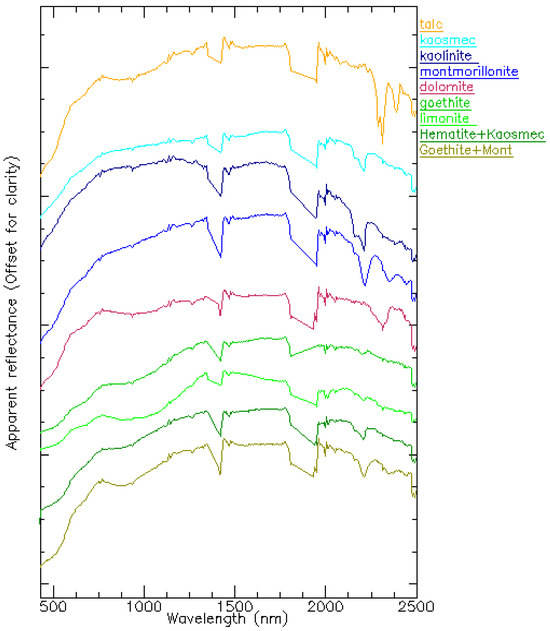 A total of nine endmembers (Figure 2) representative of different hydroxyl, carbonate, and iron bearing minerals selected from the image on the basis of shape, size and, position of spectral absorption features. A higher total score indicates higher proximity of an endmember to the designated mineral chosen from the USGS spectral library. The known versus unknown analysis revealed that the nine endmembers were talc, Kaosmec, montmorillonite, kaolinite, dolomite, goethite, limonite, goethite and montmorillonite, and hematite and Koasmec.