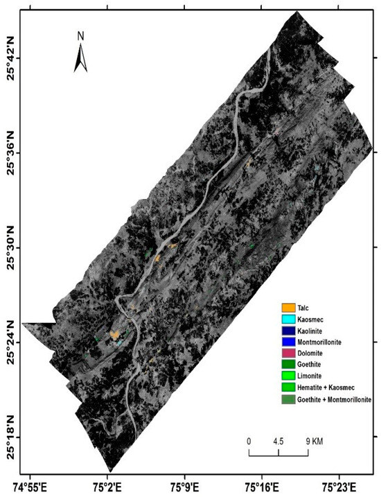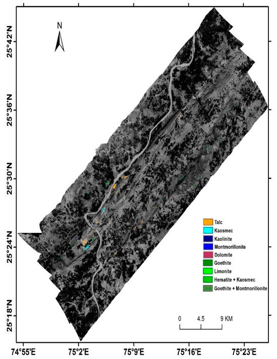 Remote sensing techniques have significantly enhanced and eased mapping of structural controls like faults, fracture systems, host rocks, and alteration/ weathered zones indicative of mineral deposits [1,2,3,4,5]. Pertinently, high spectral resolution of hyperspectral data goes in tandem with multispectral and field based methods to aid mineral exploration. Hence, image and field based reflectance and emission spectroscopy in visible to near infrared and short/mid infra-red have been employed universally as an aid in mineral characterisation and exploration [6,7,8]. Data collected by hyperspectral sensors with contiguous and coherent band parameters provide crucial help in quantitative and qualitative identification and mapping. This allows a vivid characterisation of the spatially distributed heterogeneous mineralogical paragenesis, taking cues from different advanced image processing techniques [9,10,11,12,13,14]. Thus, spectrometry becoming more sophisticated and having a greater signal to noise ratio, the arena of space-borne, field or lab-based imaging spectroscopy has enhanced the application of remote sensing in its technical capability, and its potential for geological mapping and mineral exploration [15,16,17,18,19,20].