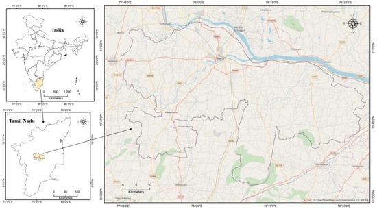 Karur district is selected as a study area, located in the Indian state of Tamil Nadu between 10.95° N latitude and 78.08° E longitude. Black and red soils are the two major soil types found in the study area (Figure 1), which is suitable for agriculture practices. Temperature ranges between 39 °C and 17 °C. The climatic condition is warmer in April to June and colder in December to January. The average rainfall of this region is 590–660 mm. During the Northeast Monsoon, heavy rainfall occurs in the month of October to December. The major agricultural crops grown are rice, cotton, sugarcane, and oil seed, while horticultural crops are banana, coconut, betel, and mango. System of Rice Intensification (SRI) techniques are commonly practiced in this study region for obtaining the maximum yield. The rice growing seasons in the study area are Samba (August), Kuruvai (June to July), Late Samba (September to October), and Thaladi (October to November). Depending upon the duration, the variety of rice varies. They are of short duration (100–120 days), medium duration (121–160 days), and long duration (141–160 days).