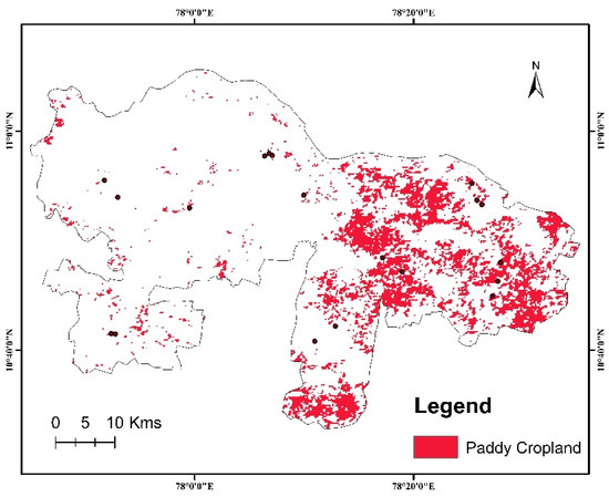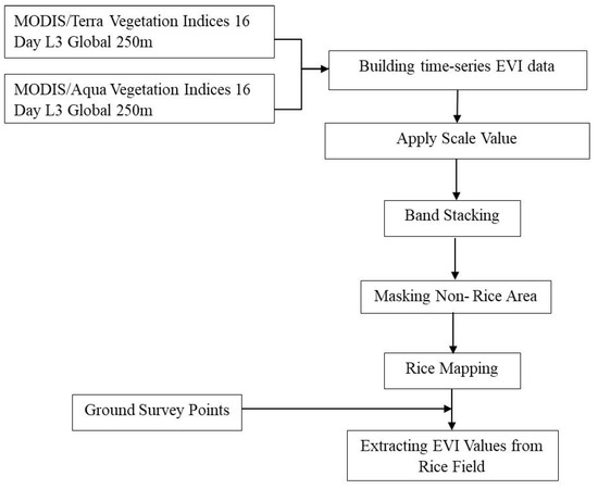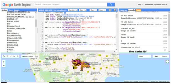 A major stable food crop for the world’s population is Oryza sativa, which provides nearly 75% of daily calorie intake for people living mainly in Asian countries. The Asian continent produces nearly 90% of total worldwide rice production [1]. Rice is of utmost importance in countries like India, China, Indonesia, and Thailand, where the crop has a profound influence on the livelihood of many farmers [2]. Reliable and timely monitoring and mapping of rice is of global importance [3]. Mapping of paddy crops helps in the estimation of water supply required for irrigation, net production, and yield estimation [4]. In spite of being a stable food crop around the world, paddy croplands account for the release of about 10% of greenhouse gases [5]. Monitoring of paddy crops in a country also aids in assessing national food security for planning and sustainable management of available resources [6]. A real time monitoring of paddy production in a region or a whole country can be carried out through remote sensing techniques [7]. Various optical and Synthetic Aperture Radar datasets include those of the Moderate Resolution Imaging Spectroradiometer (MODIS) on board the Terra and Aqua satellites, Sentinel-1, ALOS PALSAR, RADARSAT, Landsat, and EnviSat. The paddy croplands can be extracted easily as the cropland is filled with stagnant water during sowing and transplantation. Use of spectral indices such as the Normalized Difference Vegetation Index (NDVI) and Enhanced Vegetation Index (EVI) which are very sensitive to changes in water and vegetation can help in differentiating normal crops and paddy crops. This aids in the extraction of paddy fields. Numerous studies have been carried out in past decades for monitoring of paddy crop using MODIS data [8,9,10]. Recently, after the arrival of various cloud platforms such as Google Earth Engine (GEE), the analysis time and data acquiring space have been greatly reduced. Various crop monitoring studies at various levels can be carried out with the massive computational power of GEE. A large number of Earth Observations (EOs) including those of Landsat, MODIS, Sentinel and many more data products are available for open access, and can be used with code written using JavaScript. The present study aims at utilizing the massive computational power of Google Earth Engine (GEE) cloud platform for monitoring the paddy crop using the MODIS time series data over the Karur district of Tamil Nadu.