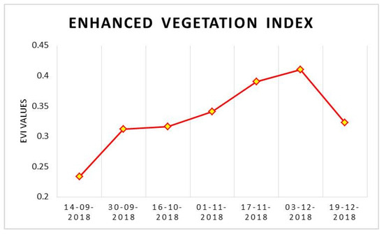 The lowest EVI value noted in the MODIS time series during pre-planting or flooding stage (September 1–15) the values were 0.3, moving towards negative. After transplantation, the EVI value was increased, indicating the start of the vegetative phase (Figure 5). This increase in EVI value during October marks the characteristic of stem elongation which generates rice canopies. Maximum EVI (0.4) value were attained during panicle initiation and the heading of reproductive stage. After crop attains its ripening stage, leaves of paddy crop undergo chlorosis with little deterioration in crop canopy. After this stage, EVI Value decreases towards 0.3 and 0.2. This EVI values demonstrate that the maximum EVI value is obtained during the reproductive stage followed by a decline in values at the matured stage, resulting with the withering of crop leaves.