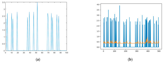 Figure 3a shows, an as example, the first 100 h of our magnitude time series. Some windows have magnitude 0, which means that no earthquakes occurred. Actually, these values are not part of the behavior of the system and they make the training of the network very difficult, as shown in Figure 3b.
