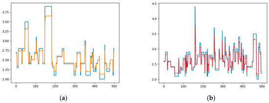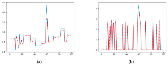 Prediction (red) versus original (blue) time series: (a) with non-zero values, (b) after removing all the non-zero values that were used to fill the zeros in the original series.