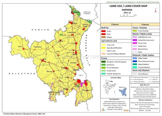 Land use land cover map of Haryana during 2011 and 2012 prepared by NRSC showing the location of Jagadhri city as the main city area in Yamunanagar district area.