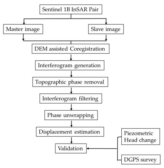 In this study, DInSAR approach has been applied to measure the surface displacement by using two pass, or repeat pass interferometric techniques that are used to find the phase difference of the complex SAR signals between the acquisitions from two different passes with a slightly different orbital position. The dataset has been chosen in such a way that the difference in orbital position would be minimal. Interferogram has been generated by the superimposing of two SAR images by subtraction of phase values in each pixel. The coherent interferogram contains several pieces of phase information, such as (a) phase difference from the spatial baseline of the data pair assuming the Earth as a flat surface, (b) topographic unevenness due to terrain ruggedness, (c) phase component due to the displacement of the terrain in range direction, i.e., the radar line of sight, (d) error due to atmospheric phase change, (e) phase due to the residual noise effect of scattering characteristics of target objects which is a function of time and thermal noise []. For the feasibility of this study, Sentinel-1A Interferometric SAR data has been collected from Alaska Satellite Facility website (https://vertex.daac.asf.alaska.edu) and the DORIS data of Verified Orbit has collected from the European Space Agency website (https://qc.sentinel1.eo.esa.int/aux_poeorb/) which is available 20 days after the actual satellite acquisition. Generally, the perpendicular baseline and time difference between the images are important in such land subsidence-related studies because several attempts have been done in different areas with different spatial baselines to find an identical rate of subsidence [,]. The distance between the two SAR image acquisitions represents a baseline, hence, there are three spatial baselines 110, 136, and 121 m and three temporal baselines of 108, 102 and 120 days for the years 2017, 2018, and 2019 respectively. SRTM 1 arc sec DEM, accessed from GMTSAR DEM portal was used in order to eliminate the topographic phase component from the interferogram. Further, the phase noise due to radar signal was removed by the Goldstein filtering technique that ultimately enhanced the fringe visibility in the interferograms, therefore, helpful to produce coherence images as well. Noteworthy, the coherency ranges between 0 and 1 while the high coherence produced a better quality of interferogram. Atmospheric correction was not performed in the present study, instead of that, the dates of image acquisitions were selectively chosen from January in winter season and April in pre-monsoon season such that the amount of atmospheric moisture present would be minimal in order to avoid the atmospheric noise that usually originates due to variations in atmospheric condition during data acquisition. In the present study, phase unwrapping is performed to resolve this 2π ambiguity using minimum cost flow algorithm []. The methodology adopted in this study for DInSAR processing represented in Figure 3. The line of sight (LOS) displacement, i.e., in range direction has been calculated using the following formula: