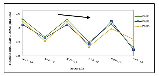 DInSAR technique with three pair of Sentinel 1A images of the years 2017–19 was used to study the temporal and spatial evolution of land subsidence in the study region of Jagadhri city area. Using these three pairs of SENTINEL 1A data for 2017–19, the generated D-InSAR interferograms are shown in Figure 4 for 2017–19, while the mean coherence obtained for these three D-InSAR pairs are 0.36, 0.41, and 0.39 respectively (Figure 5). The specular pattern of deformation fringes is observed at the central part of the city area centered at 30°08′N, 77°18′E. The consistency of this fringes during three consecutive years shows that the subsidence in this area is not any sudden activity, it is a result of regular exploitation for human resources. Not only that, it also indicates that the fringes are not because of atmospheric noise. The pattern of fringe is found to be almost similar for each year. The areal extent of the fringe is around 25 sq.km. and slightly more stretched in south-west to north-east direction by 10.75 km. The displacement from the fringes and subsequent observation from DGPS survey method is tabulated in Table 2 which shows that the mean displacement in the fringe area during 2017–19 estimated by D-InSAR method was 4.98 cm, while the mean displacement over a selected location (30°11′N, 77°27′E) at the city area during the same years acquired by DGPS survey was 4.44 cm. Therefore, the estimation carried by the relative error of overestimating by the magnitude of 0.56, 0.67, and 0.39 cm during 2017–19, respectively. Another specular feature has been pointed out from the coherence images that the areas with the footprint of deformation are spreading out away from the city center area radially which signifies that the settlements situated along the roadside are most responsible for excessive exploitation of groundwater, thus facing the threat of subsidence. Therefore, this settlement area is surely endangered for unexpected destructions in the near future. The displacement rate was noticed to be higher during 2019 than 2017 but a little lesser than 2018. Hence, more consecutive investigation might get a more accurate trend of change in displacement rate. The lithology data shows a thick and alternative layer of clay underneath the area. The upper fine-textured soil leads to a slow rate of liquefaction of water hence the rate of percolation followed by the rate of groundwater recharge will be very slow in such region. On the other hand, the underneath alternative layer of brownish clay with grained sand material is prone to be suppressed and hence the extraction of groundwater at a higher rate than recharge can be able to create a vacuum which may lead to local subsidence. The piezometric data from three different wells during November and April also show a subsequent decrease in the water level in the wells (Figure 6). It was purposefully collected during November and April to get the scenario of extraction of water from the wells during non-monsoon months. Observation shows that the average depth of water table during November was 2.86 m and during April it was 3.43 m., the decrease in water level in April was 1.2 times than November. Hence, it is well supported by the incidence of over-exploitation of groundwater in the city area.