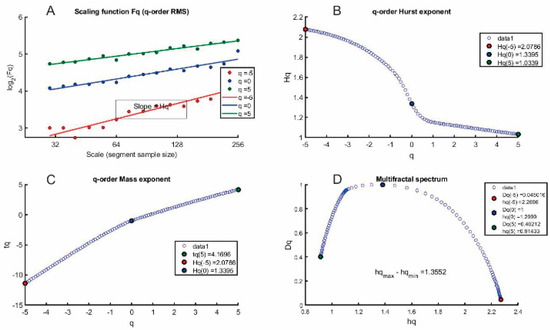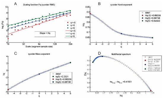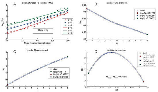 where (q) can take any real value except zero. For different values such as q = 2, the scalar exponent h(2) provides information on the fluctuations of the data series. By repeating the process described above, the s time scales vary if the function increases as s increases. It should also be noted that depends on the order m in the DFA, which is defined as s ≥ m+2.