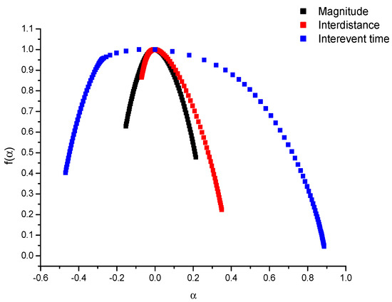 Based on the data reported in Table 1, and by comparing the three multifractional spectra (Figure 5), it is observed that the interevent series has a greater degree of multifractality than the other two series, and that the inter-distance series presents a multifractality slightly greater than the magnitude series. All series appear biased to the right, which is consistent with r > 1. This indicates that small variations in the series are more dominant than large fluctuations. It seems, also, that such dominance is more intense for the interevent series than the other two series.