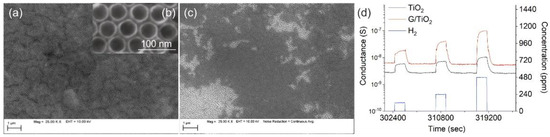 (a,b) SEM images of the TNTs, (c) SEM micrograph of the composite (G/TiO2), (d) dynamical response of the composite (G/TiO2) and pure TNTs towards 120, 240 and 480 ppm of H2 at 300 °C.