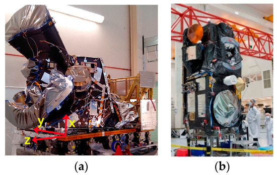 SLSTR Front side (a) and disposition in Sentinel 3 satellite (TAS-F courtesy) (b) (the instrument reference frame is defined as –X = satellite speed direction, −Y = cold space view direction, +Z = nadir view direction).