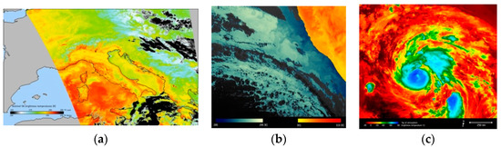 SLSTR thermal images: (a) Italy and Mediterranean sea, (b) Namibian SST and LST, (c) Ophelia Hurricane temperatures (from ESA web site).