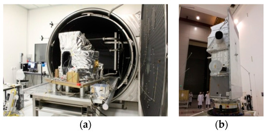 PRISMA instrument in the Leonardo cleaning room (a) and placed in the satellite (b) (ASI and OHB-I courtesy).