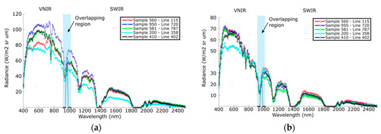 PRISMA Radiances (mW/m2/sr/nm) as a function of wavelength (nm) acquired on vegetated (a) and non vegetated surfaces (b). Each curve corresponds to a different pixel.