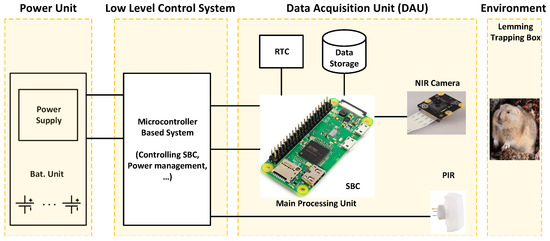 Full time monitoring is desirable but inaccessible due to shortage of power sources. Therefore, a sample based approach directed by a passive infrared (PIR) motion detection sensors is suggested such that videos will be recorded for limited periods only during the presence of lemmings inside the box. The heart of image acquisition and data storage units is a single based computer (SBC). For this purpose, we used Raspberry Pi. Interaction with other parts of the system, including camera and real time clock is done through low-level programming rather than operation system (e.g., Windows or Linux). A low-level processing unit controls the operation of SBC by monitoring sensory signals, including the motion detection sensors. Recorded videos are stored in a SD memory card.