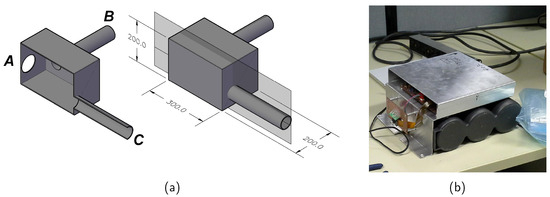 (a) The lemming trapping box. The left image is the cross section of the box along the light gray plane. A lemming can freely enter the box or leave it via entrances B and C. (b) First prototype of the system.