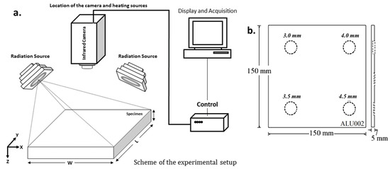 Aluminum is extensively employed in many industrial and aerospace structures, it is also considered to be a benchmark for the performance evaluation of thermographic methods under laboratory conditions. The data-set was assembled using following an experimental scenario regarding and acquisition parameters as described in [7]. The inspection was conducted from the front side of the specimen in reflection mode (having a depth range from 0.2 to 1 mm). Two photographic flashes were used (Balcar FX 60, 5 ms thermal pulse, 6.4 kJ/flash) and a MWIR infrared camera (Santa Barbara Focal plane (nitrogen cooled, InSb, pixels). The acquisition parameters were tuned as: Sampling rate, 157 Hz; Duration, = 6.37 s; Time step, = 0.025 s; truncation window, 6.37 s; total number of frames = 250 (Figure 1a). Figure 1b shows the scheme of the specimen which has been utilized [7].