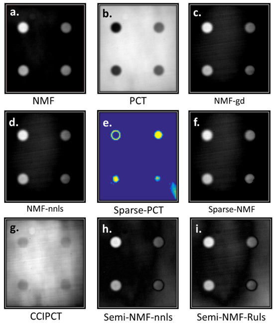 Evaluation of the qualitative accuracy of Semi-NMF (h.,i.) versus the state-of-the-art approaches (a.–g.) in thermography.