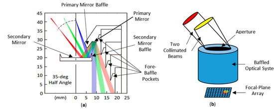 Consider the arbitrary optical instrument, shown in Figure 1b, which consists of an aperture, a baffled optical system, and a Focal-Plane Array (FPA). Not shown is the filter that establishes the instrument passband. Two collimated beams are incident to the aperture from directions and. Some of the energy carried by the beams is absorbed in the baffle and the rest is incident on the FPA, as indicated by the red and yellow spots on the FPA.