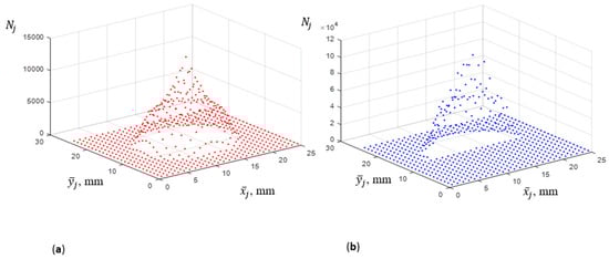 During a Monte Carlo simulation, one hundred million rays are traced into the aperture of the DEMETER concept instrument of Figure 1a. Figure 2a shows the distribution of the rays on a 25-by-25-pixel FPA when the directional distribution of the rays arriving at the aperture corresponds to a blackbody calibration source, and Figure 2b shows the ray distribution on the FPA when one-half of the entrance aperture is occluded. If the transfer function defined by Equation (2) is truly an instrument constant, then the ray distributions in Figure 2a,b on the half of the FPA illuminated in both simulations should be identical. The degree to which this is not true is governed by (a) the inherent accuracy of the ray-trace and (b) scene dependence of the transfer function.