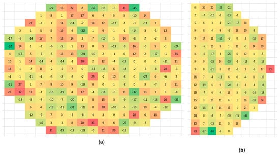 (a) Percentage difference in the number of rays absorbed by each pixel when the instrument is regarding the same blackbody calibration source based on two different random number sequences, and (b) percentage difference in the number of rays absorbed by each pixel between the calibration case of Figure 2a and the test case of Figure 2b.