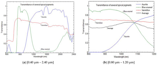 Transmittance of several typical paints, used historically in Italy in spectral region [0.80 μm – 1.20 μm], modified after [1], with permission. All three transmittance curves have about the same value of 0.65 at wavelength 1.080 μm. The black transmittance curve [denoted average in part (b)] shows the average paint obtained by adding up all three contributions and dividing it by 3. It has a broad peak at about 1.050 μm.