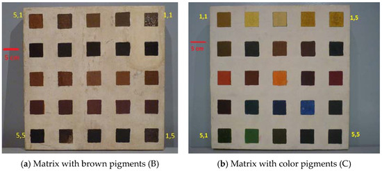 We employed two pigment matrices: for color pigments (C) and for brown pigments (B), shown in Figure 2. On B, each column on each matrix features a different pigment and each row features a different substrate. On C, each row is a different pigment and each column a different substrate. On some elements, the under-drawing even in the visible is noticeable. This is quite noticeable for the color matrix, elements 1.2 through 1.5, and the blue 4.4. The dark blue color pixel, denoted 4,3, appears visually quite opaque.
