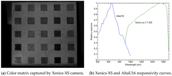 (a) Color matrix as seen by Xenics-XS camera; (b) Responsivities of two cameras from 800 nm to 1700 nm, with peaks normalized: the LLL intensified AltaU16 and the Xenics-XS.