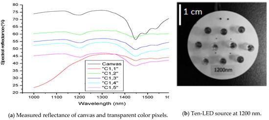Measured reflectance signature depends on the spectral content of the source of illumination and the reflecting surface. (a) Measured reflectance of canvas and transparent color pixels; (b) Ten-LED source at 1200 nm [2].