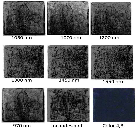 Multispectral imaging of the Color pixel 4,3 (lower right corner) indicates dark blue color observed in the visible. Different degrees of transparency are indicated when this pixel is illuminated with the IR radiation. The central wavelength in nm of the illuminating lamp is indicated below the sample, ranging from 1050 to 970 nm. The best quality of the underline image is obtained with illumination at 970 nm. The image quality decreases with increasing wavelength.