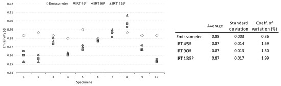 The results of the emissivity measured with the two methods are depicted in Figure 2, were for each specimen and method the result is the average of three measurements. The two methods returned a very similar average emissivity: 0.88 and 0.87, for the emissometer and for the infrared thermography, respectively. These values are in line with the lower limit of the range found in the literature. However, a larger variability can be observed when using infrared thermography. The effect of the camera position was not important, which was already expected, as angles below 60 ° do not influence the measurement in non-metallic materials [9].