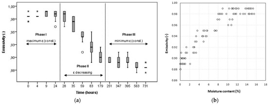 (a) Emissivity versus time; (b) Emissivity versus moisture content. (In both Figures, the average of three measurements for each one of the ten specimens under study was considered).