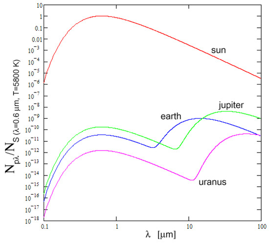 Normalized number of spectral photons, emitted per unit time and area by Sun and various planets at 10 parsec from our solar system, vs wavelength [1].