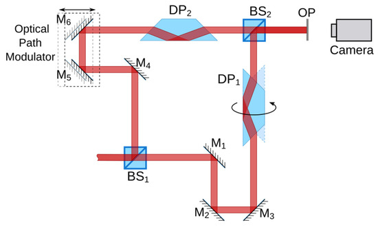 The RSI based on a Mach-Zehnder layout incorporates a movable, rotary Dove prism in one arm to rotate the beam and a stationary one to compensate the optical path in the reference arm. Furthermore, we introduce a periscopic arrangement in each interferometer arm as a phase retarder to enhance the fringe visibility. The layout incorporating two optical path modulators, one in each arm, is presented in Figure 2.