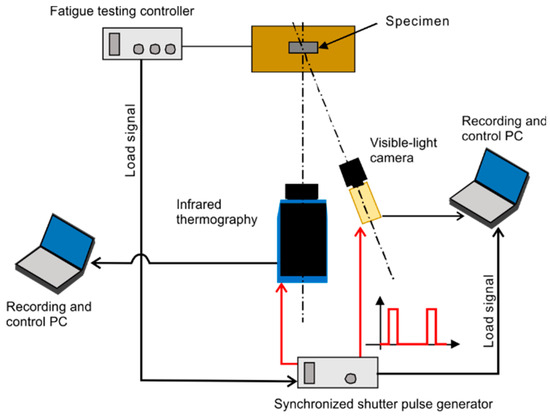 In the proposed method, visible images and infrared images are obtained at same timings for same surface, synchronously. A schematic illustration of the recording system is shown in Figure 1. The infrared thermography and the visible-light video camera are driven by the shutter pulse supplied from the synchronized shutter pulse generator, so that synchronous imaging becomes possible. The load signal from the controller of fatigue testing machine is recorded at same timings. The loading signal waveform can be used as the time stamp of visible image and infrared image.