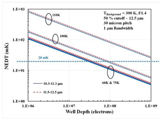 Figure 3 shows a case study performed with the experimental values obtained from the 12.5 μm cutoff LWIR BIRD FPA operating at various temperatures from 60 K to 110 K with 250 K background and f/1.4 aperture. Figure 3 clearly shows the two LWIR Landsat bands, from 10.3–11.3 μm and 11.5–12.5 μm (Landsat bands) can achieve 20 mK NEΔT with a DROIC with 100 million electrons well depth. Furthermore, LWIR BIRD FPAs could operate at even higher temperature with DRIOCs having greater effective well depths.