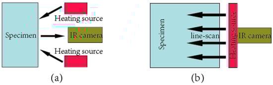 Figure 2b) with the aim to introduce its advantages. Instead of the stationary set-up of the FT modality, LST uses a dynamic line heating source operated by an anthropomorphous robot. The line heating source covers the whole large-scale specimen both in time and space, while the camera moves after the heating source synchronously to gather the thermal signals. More information regarding the system can be found in [