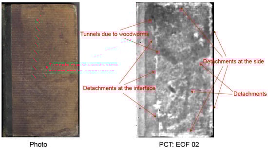 Figure 3 shows the flash thermography result after PCT processing. The latter reorganizes data into new components that take into account the main spatiotemporal variances of the sequence. Through this conventional technique, the natural defects in the book cover are shown in the thermal image clearly. The visual inspection was a fundamental step to distinguish the defects found. These defects are due to some of the factors listed into the Introduction section.