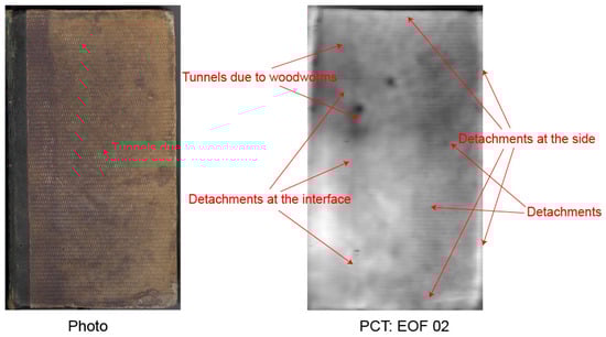 Figure 4 shows the LST results after the application of the PCT technique. It is possible to see how detachments are located mostly on the edge areas, as well as at the interface between two different materials. This is a clue concerning the position of the book in time. Mechanical forces, mostly force of gravity and sliding friction, may cause such defects. Incorrect hygrothermic conditions of preservation can be at the base of the biological attacks signaled in