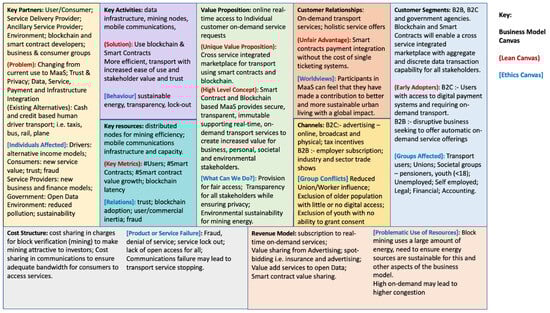 The Business Model Canvas (BMC) has the Value Proposition at its core [], so offers a suitable framework to analyse the value implications of DLT and blockchain for MaaS, given its previous use to evaluate new mobility services including within Living Lab conditions []. Further value generation alternatives have led to the evolution of advanced versions of the BMC, such as the Lean Canvas—LC [] or the Ethics Canvas—EC [] to deal with novel and disruptive emerging products and services, such as MaaS. In order to conduct an advanced evaluation of DLT and blockchain, this paper uses an integrated BMC+LC+EC canvas (Figure 1). Figure 1 presents MaaS value creation analyses for both existing incumbent enterprises and emerging disruptive and lean start-ups while overlaying the ethics and privacy requirements for businesses in the era of GDPR which can create additional value from MaaS.