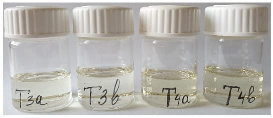 Microemulsions are thermodynamically stable and transparent systems composed of an aqueous phase, oil, a surfactant, and usually also contain a co-surfactant []. They have the capacity to incorporate large quantities of hydrophilic and lipophilic active principles, protecting them from degradative reactions and ensuring delivery of the cosmetic actives []. Due to these characteristics, microemulsions are adequate for the delivery of topical cosmetic actives. In order to create microemulsions with dermatocosmetic applications, grape seed oil was used as the oily phase, Tween 80 and plurol diisostearique CG as the surfactant blend, and ethanol as a co-surfactant for some of the samples. All components are safe for skin and are used as cosmetic ingredients. The obtained systems (Figure 1) were physically characterized based on electrical conductivity, dynamic light scattering, and rheometric measurements.