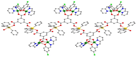 Compound 1 is a coordination polymer bridged with a bidentate perchlorate ligand and it was obtained from Cu(ClO4)2·6H2O and the condensation product of 5-chlorosalicylaldehyde and 2-picolylamine. The copper atom is hexacoordinated: Four of the coordination sites are occupied by the three donor atoms of the Schiff base ligand and one oxygen atom from a water molecule that have a square-planar arrangemet and the apical sites are occupied by two perchlorato ligands. Complex 2 was obtained from the first one, overtime. The experimental research has shown that after a few days, in the absence of any interfering factors, the polymer crystals change their shape turning into a mononuclear copper complex where the geometry around the copper(II) ion is square pyramidal. Compound 3 was also prepared by the reaction of 5-chlorosalicylaldehyde and 2-picolylamine in the presence of a copper salt—Cu(ClO4)2·6H2O, Ph3SnCl and deprotonated trimesic acid. From the stereochemical point of view (Figure 1), two copper atoms are triply bridged by one of the trimesic acid carboxylate group and by the phenolic oxygen atoms of two tridentate Schiff base ligands. Each copper(II) atom is five-coordinated with a square pyramidal geometry. Tin(IV) atoms are pentacoordinated having a trigonal bipyramid geometry.